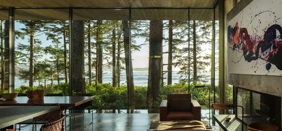 The project pictured below in British Columbia, Canada is located on a peninsular on the west coast of Canada, overlooking the North Pacific Ocean. The frameless glass walls open the living area to panoramic views of forest and ocean whilst providing robust protection from the elements.