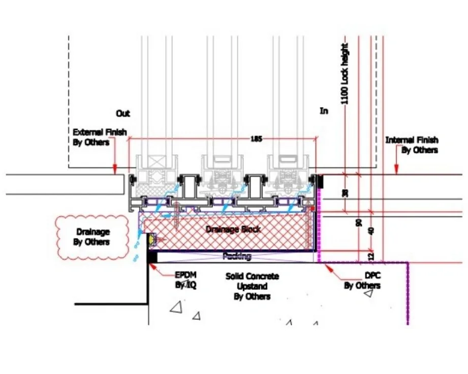 IQ have developed our own drainage channel for our luxury minimal sliding doors, which utilises a solid Neoprene base block. This Neoprene drainage block is installed beneath each installation of sliding glass doors to drain away any water from the sliding panes, filtering it through the aluminium base.